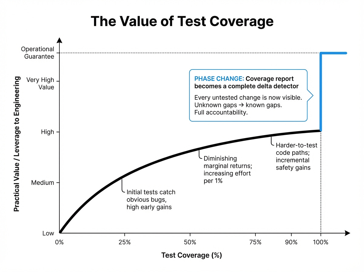 Coverage, as we use it, isn’t strictly about bug prevention; it’s about guaranteeing the agent has double-checked the behavior of every line of code it wrote.