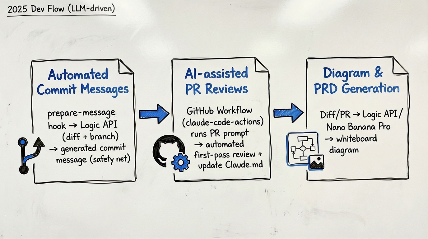 The first change we made was automating commit messages, which also double as our pull request descriptions. LLMs are really good at taking a series of changes and following a set of guidelines to summarize them into something smaller.