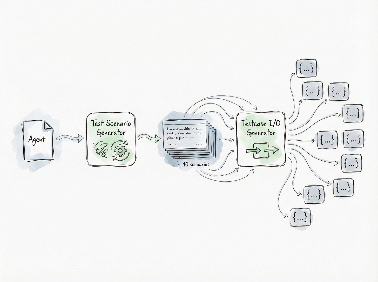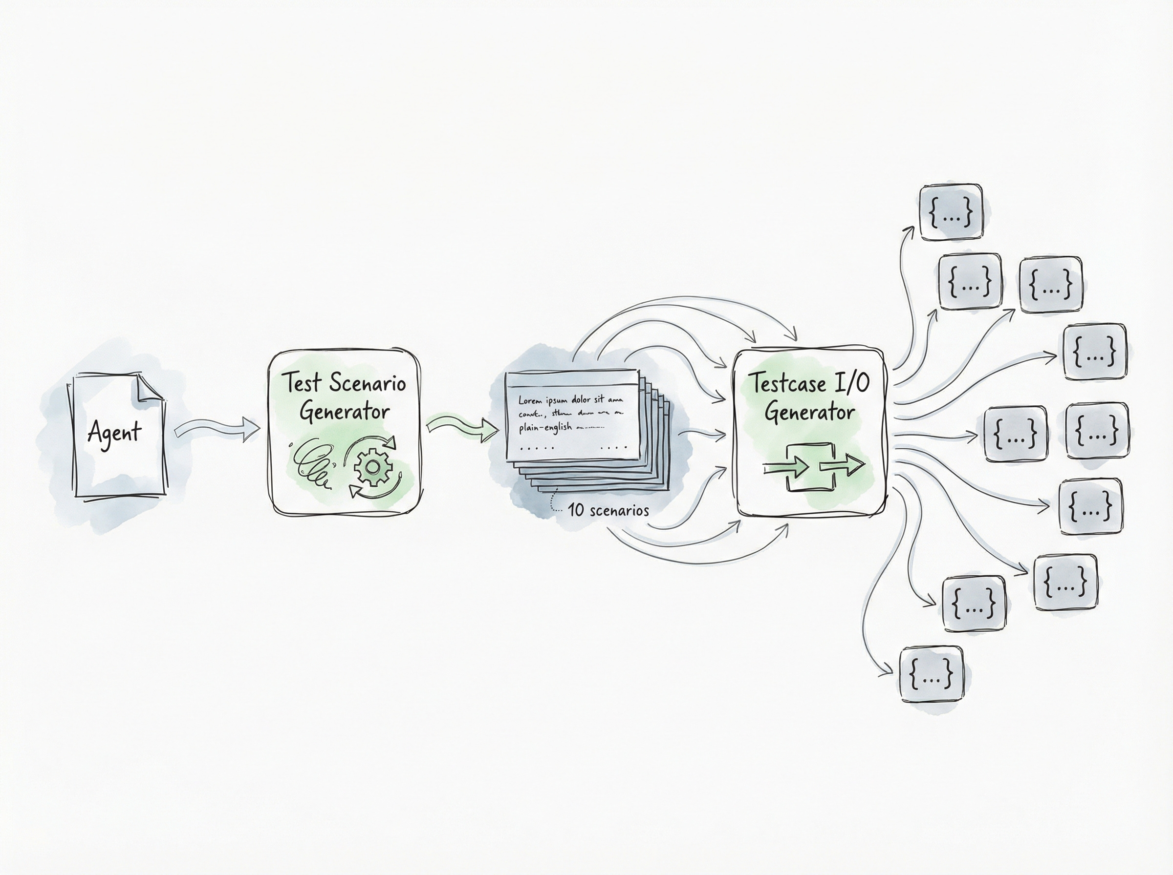 Using a single agent to generate scenarios gives us broad coverage while avoiding overlapping test coverage. Creating inputs + outputs in parallel allows test cases to be generated in parallel while taking advantage of the full LLM context window. Meaning tests that might have large inputs or outputs don’t compromise other tests that don’t.