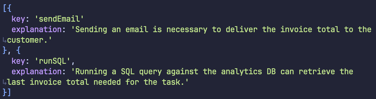 The model correctly ignored other tools (createInvoice and webSearch) because it reasoned they weren’t needed for this specific request.