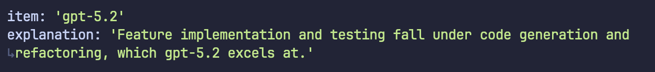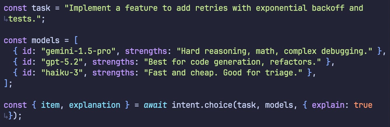 Sometimes you need exactly one winner. We can use intent.choice(…) for that. For example, if you wanted to dynamically pick an LLM to run a specific task based on fuzzy criteria.