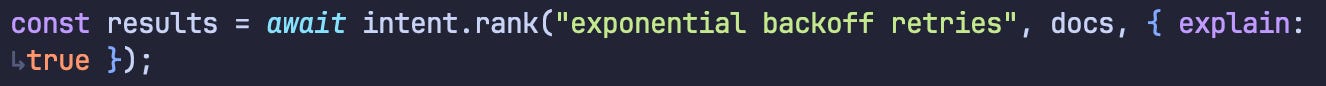 And of course, standard reranking with intent.rank(…). Because we can see the explanation, we can also share with our users why they’re seeing the thing they’re seeing.