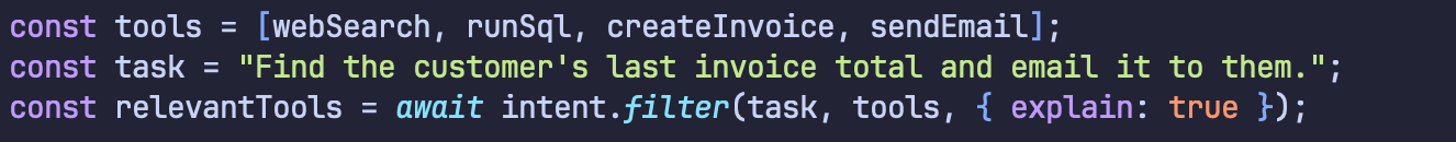 Sometimes you don’t want a ranked list; you just want an applicable subset. You can use intent.filter(…) to decide, for example, which tools an agent should have access to for a specific task.